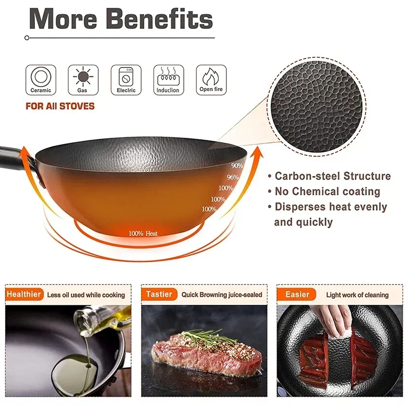 Made of high-quality black carbon steel, so that the wok has super durability, and has an unprecedented natural non-stick coating characteristics, so you can easily remove stains.